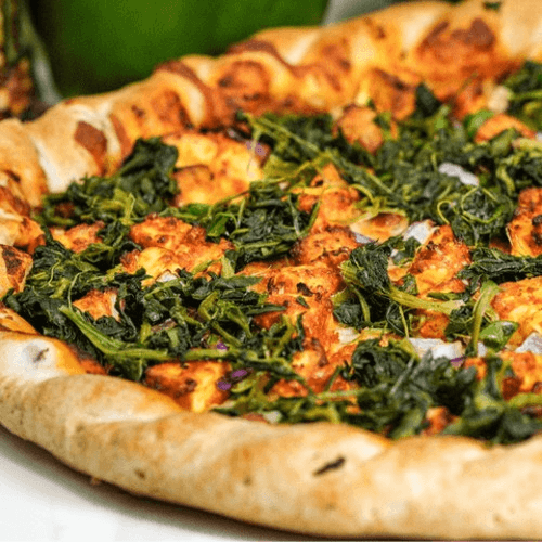 Alfredo sauce, spinach, chicken, red onion, and bacon. Regular crust