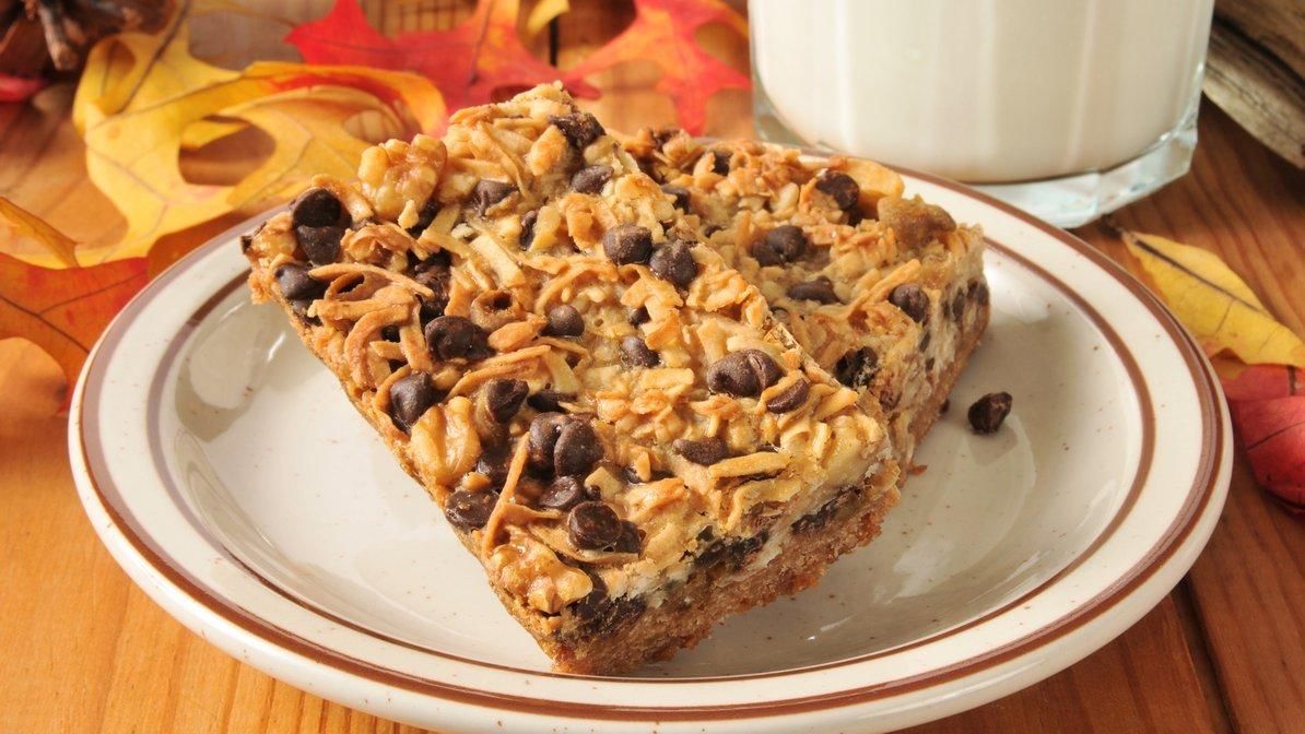 Layers of chocolate chips, shredded coconut, and nuts on a Graham cracker crust